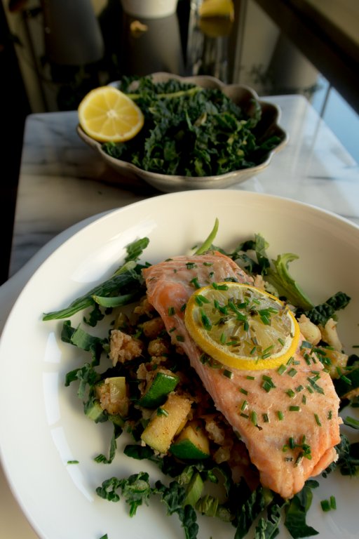 Sätt ugnen på 200 grader. Lägg de tinade laxfiléerna i en form. Strö över salt och peppar och lägg på en skiva citron. Strö över lite hackad gräslök. Ugnsstek laxen i ca 12 minuter tills genomstekt.