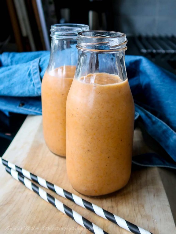 Mixa pumpan (gärna halvfrusen) slät i en blender. Tillsätt övriga ingredienser och isbitar.
